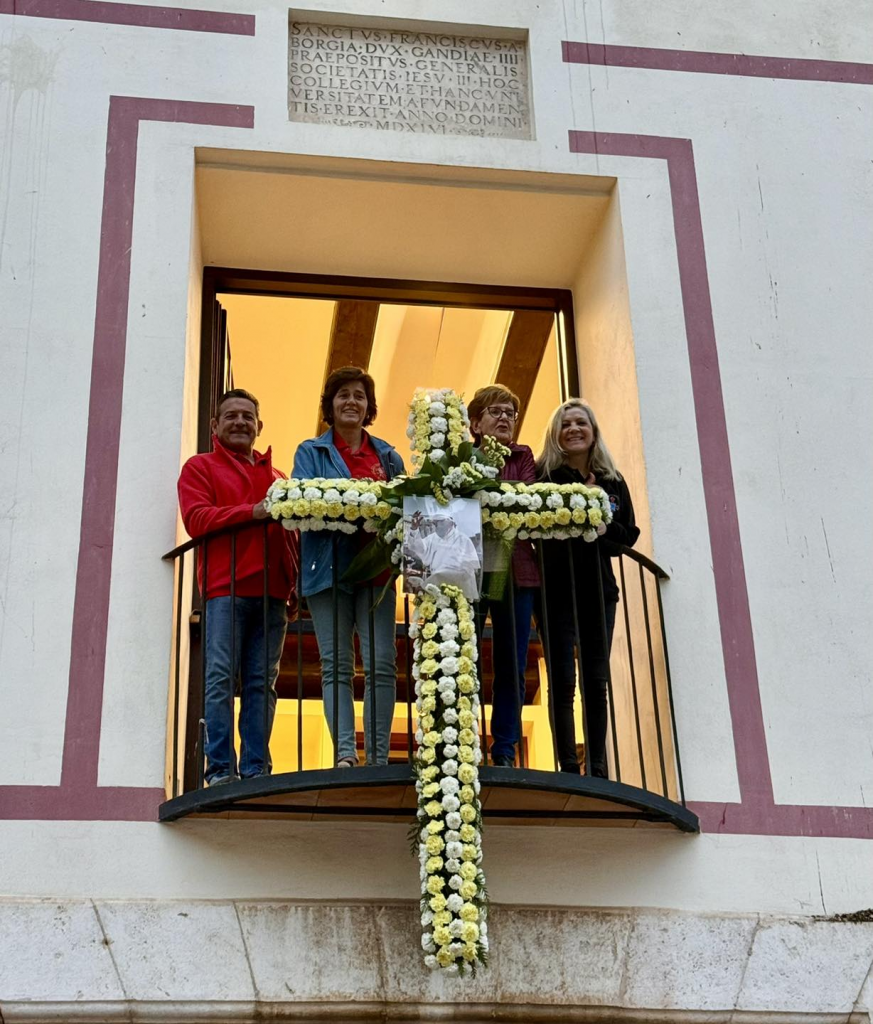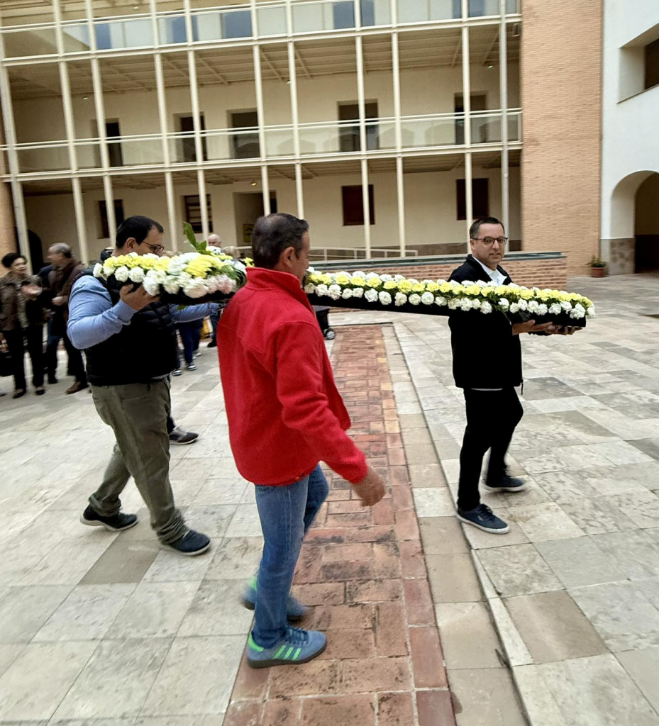 La cruz, decorada con claveles blancos y amarillos —colores del Vaticano—, lucía en su centro una imagen del Papa Francisco, fallecido recientemente, como homenaje a su pontificado.